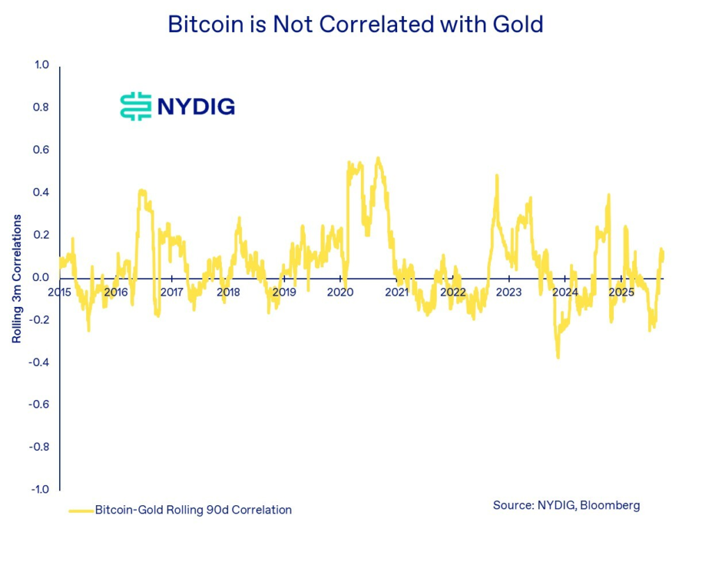 Lebih lanjut, NYDIG menyoroti dua faktor makroekonomi utama yang memengaruhi pergerakan Bitcoin: suku bunga dan jumlah uang beredar. Bitcoin cenderung naik ketika suku bunga turun dan likuiditas meningkat — pola yang juga terlihat pada emas.