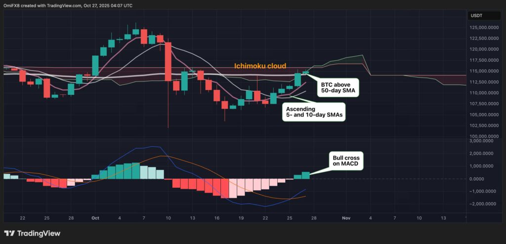 Harga Bitcoin (BTC) kembali menunjukkan tanda penguatan setelah berhasil menembus di atas 50-day Simple Moving Average (SMA) — indikator penting yang sering digunakan untuk mengukur arah tren jangka pendek. Saat ini BTC diperdagangkan di kisaran $111,700, menandakan potensi pergeseran momentum dari netral ke bullish.